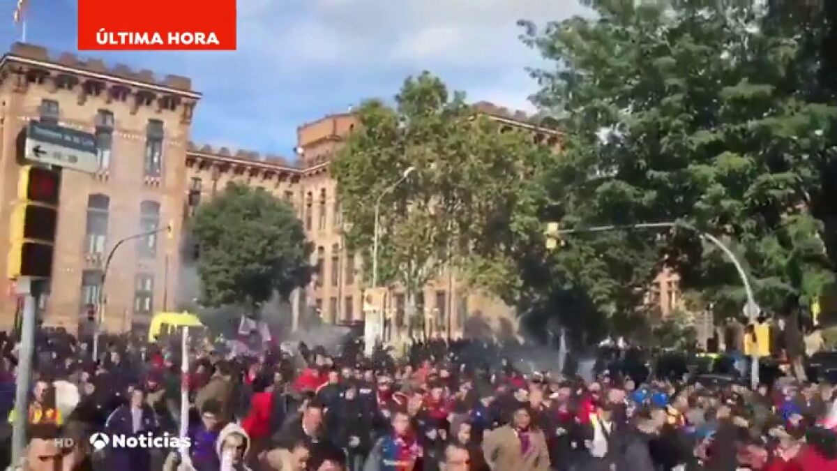 La carga policial se desencadenó después de que cerca de 250 radicales culés lanzaran varios petardos contra los cuerpos policiales, como se ve en las imágenes de 'ElNacional.cat'.