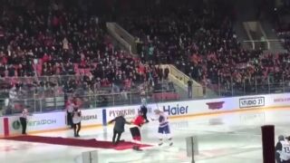 José Mourinho no ha tenido su mejor día en Rusia. El entrenador fue el encargado de hacer el saque de honor antes del Avangard-SKA de la Liga Kontinental de hockey hielo, un momento que acabó con el portugués por los suelos.