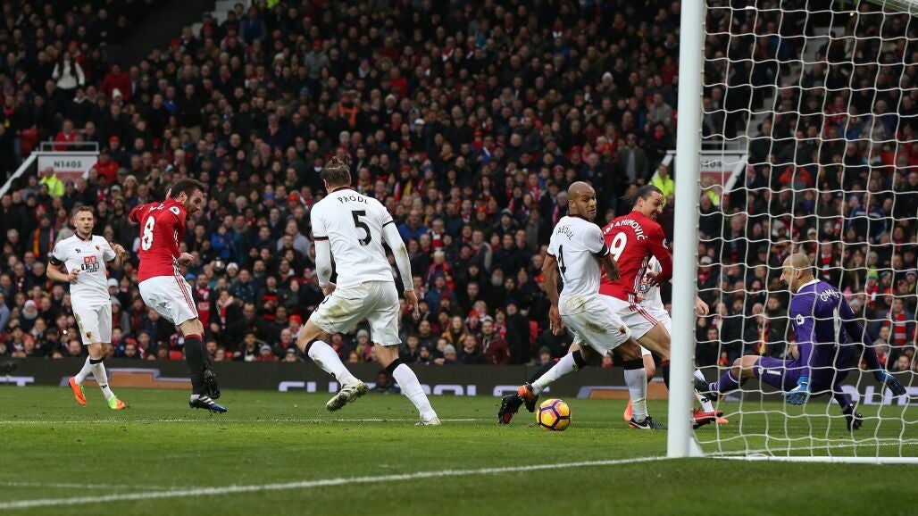 El Manchester United, gracias a los goles de Juan Mata y Anthony Martial, derrotó este sábado en Old Trafford a un ultradefensivo Watford (2-0) y se colocó a tan sólo un punto de los puestos de Champions League. Los hombres de José Mourinho se han colocado provisionalmente quintos -a falta del partido entre Liverpool y Tottenham Hotspur, con 48 puntos, a uno de sus vecinos del Manchester City, último equipo en Champions, que cierra la jornada 25 de la Premier League en Dean Court ante el Bournemouth.
