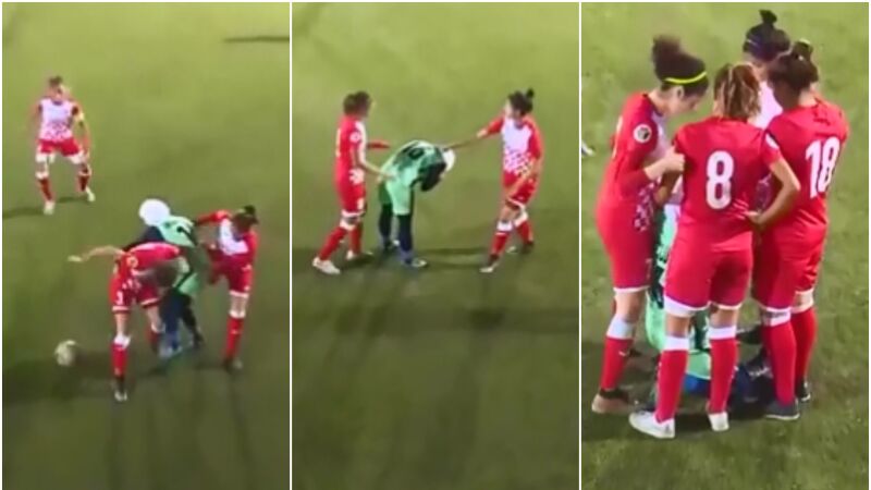 La futbolista recibió una entrada que provocó la caída del yihab que llevaba en la cabeza. Inmediatamente, la jugadora se agachó para colocarlo de nuevo cuando para sorpresa de todos, cinco de sus rivales acudieron en su ayuda para rodearla y que nadie pudiera ver su pelo mientras volvía a colocarlo.