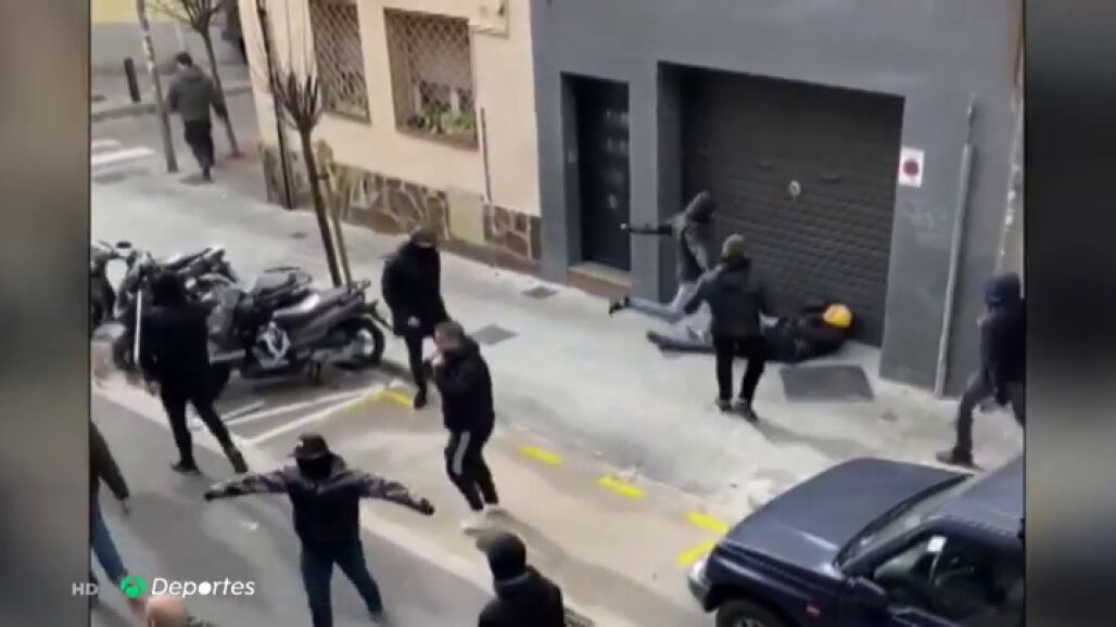 La terrible secuencia de la agresión con sillas y mesas a un aficionado del Espanyol que terminó en el hospital