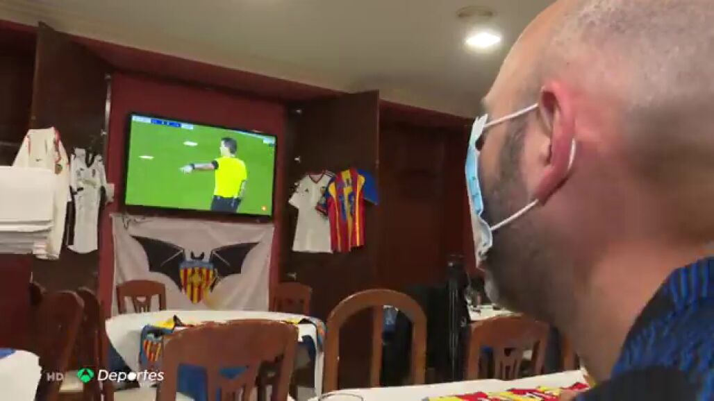 Una peña valencianista en Madrid se reunió para ver el partido, pero algunos de sus miembros hasta llevaban mascarillas... eso sí, mascarillas tuneadas con los colores de su equipo, el Valencia.