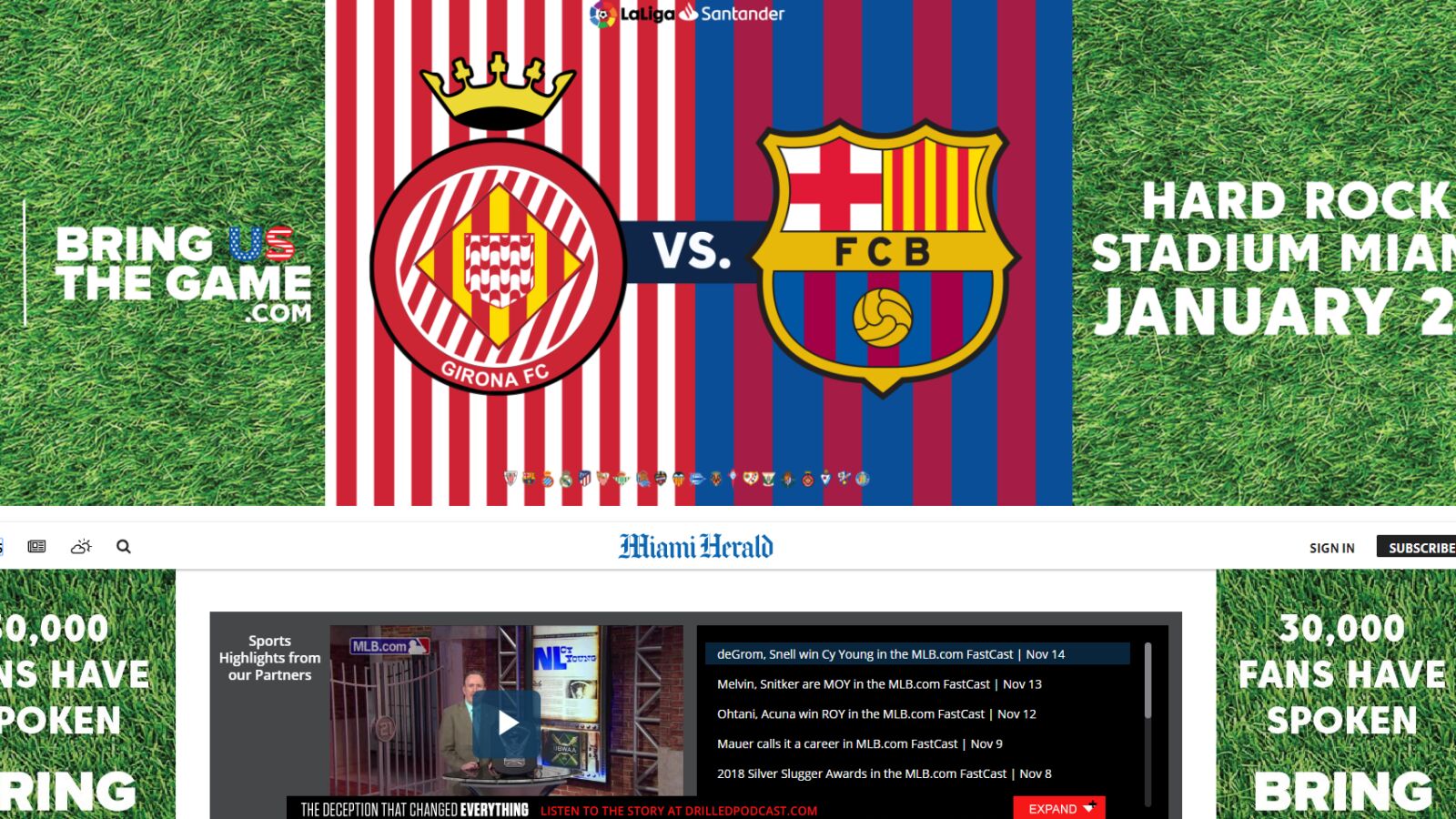 'Bring us the game'. 'Traednos el partido'. Los lectores del Miami Herald se han encontrado hoy, tanto en la edición en papel como en la página web, con una campaña de publicidad de la Liga para tratar de jugar en el Hard Rock Stadium el partido Girona-Barça de la Liga.