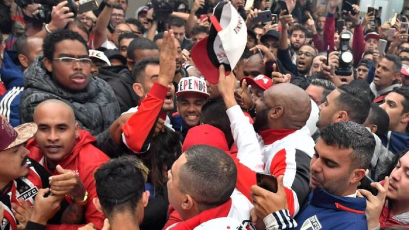 Alves, que vestirá la camisa número 10 del Sao Paulo y será el jugador con mayor salario en la actual Liga brasileña, tuvo que contar con la ayuda de agentes de seguridad para abandonar Congonhas ante la presión de cientos de hinchas que agitaban banderas y llegaron a usar fuegos de artificio para saludarlo.