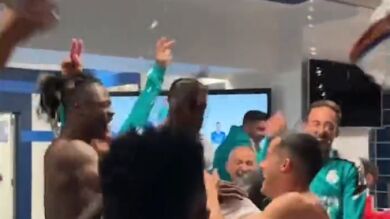 La celebración estuvo primero en el césped con la afición que llenó las gradas del Santiago Bernabéu. Después se trasladó al vestuario. Al entrar, la actitud de todos los jugadores era la misma gritos de '¡Vamos!', aplausos y choque de manos. Florentino Pérez bajó a felicitar uno por uno a los jugadores y protagonizó un abrazo con Ancelotti. Ya sin presencia institucional, vino la revolución.