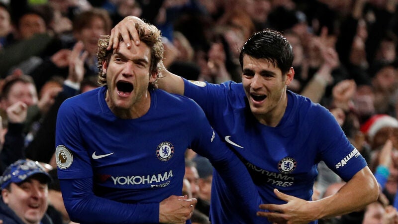 Dos goles de cabeza de los españoles Álvaro Morata y Marcos Alonso, al rematar sendos servicios de sus compatriotas César Azpilicueta y Cesc Fàbregas, respectivamente, dieron el triunfo al Chelsea ante el Brighton (2-0) en la vigésima jornada (Boxing Day) de la Premier League inglesa de fútbol.
