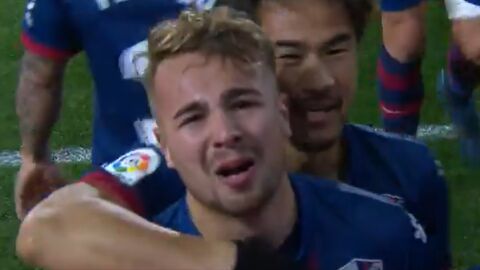 El extremo del Huesca anotó un golazo en el minuto 66 para poner el 1-0 en el marcador. Recibió en la frontal, se adentró al área, recortó y batió a Pacheco. La celebración no pudo ser más emotiva: el '15' cogió su espinillera, se fue a la cámara de televisión más cercana y, con lágrimas en los ojos, gritó al cielo "Te amo, te amo".