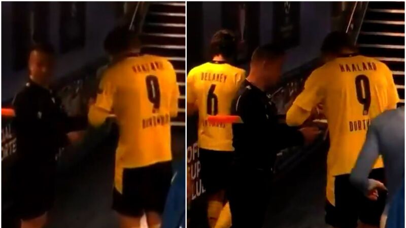 El árbitro rumano esperó en el túnel de vestuarios hasta que vio aparecer a ErlingHaaland y no dudó en pedirle que le firmara un autógrafo en las propias tarjetas, la amarilla y la roja. El delantero noruego no tuvo problema en detenerse con el juez de línea y dedicarle la firma.