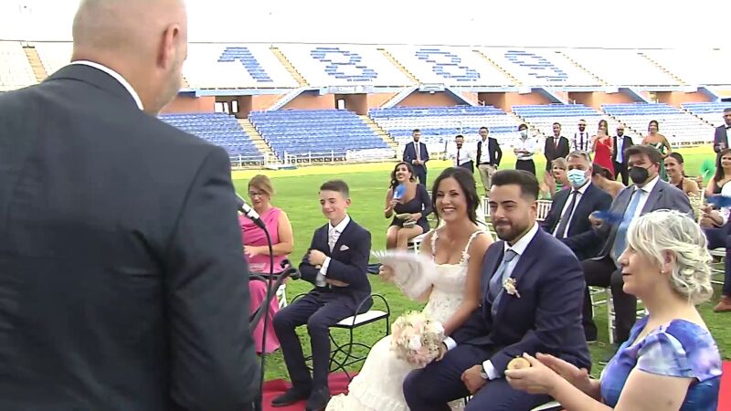 Ambos se dieron un peculiar y emotivo sí quiero en el estadio del decano español. Sin duda, una celebración que nunca van a olvidar... ¡Que vivan los novios!.