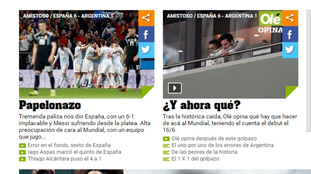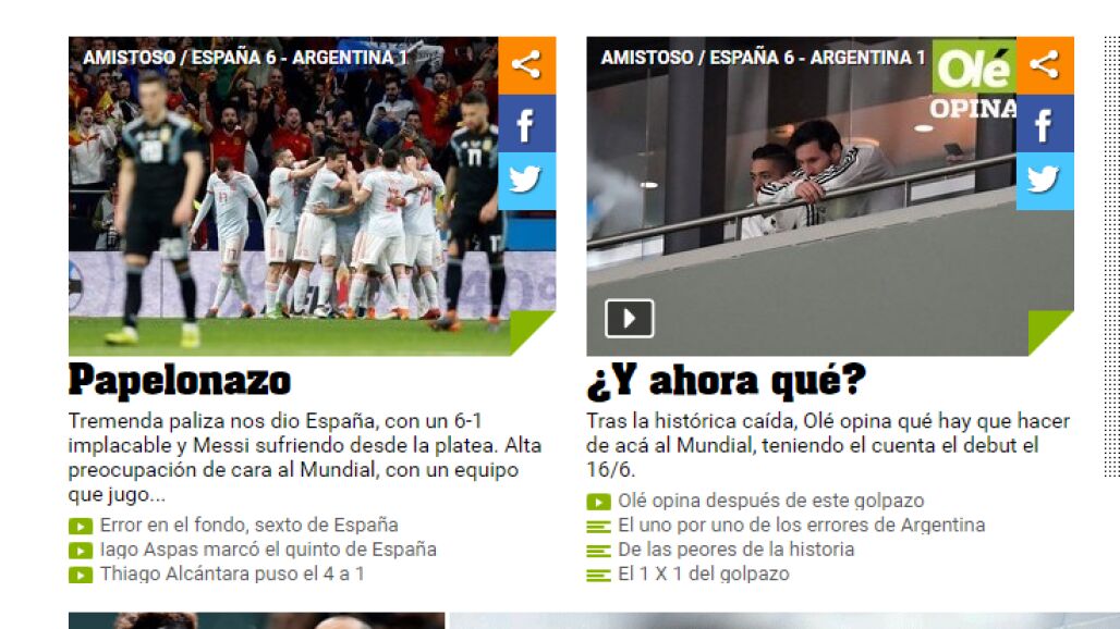 El medio 'Olé', el deportivo más conocido en el país, titulaba 'Papelonazo': "Tremenda paliza nos dio España, con un 6-1 implacable y Messi sufriendo desde la platea. Alta preocupación de cara al Mundial, con un equipo que jugó muy mal y se regaló atrás".