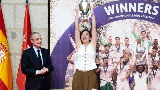 La presidenta de la Comunidad de Madrid ha levantado la minichampions que Florentino le ha regalado en persona. Así ha sido el momento anecdótico en la sede de la Comunidad de Madrid.