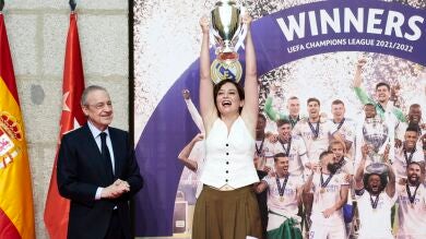 No obstante, el momento del acto se ha producido cuando el presidente del Real Madrid le ha entregado a Díaz Ayuso una copia en diminuto de la orejona, la política del PP la ha recibido con una sonrisa en la cara y ha levantado el trofeo emulando a Marcelo en París. Los jugadores blancos vitorearon a Ayuso y aplaudieron el gesto de la líder madrileña ante los presentes.