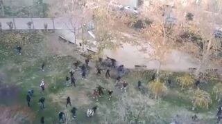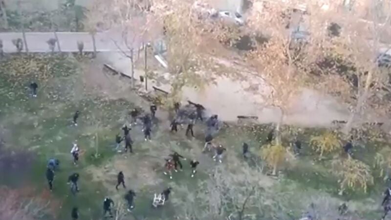 En las imágenes, grabadas desde un balcón y difundidas a través de las redes sociales, se puede ver como radicales de ambos equipos se emplean con verdadera violencia, lanzándose piedras, sillas y todo lo que encuentran a su paso.