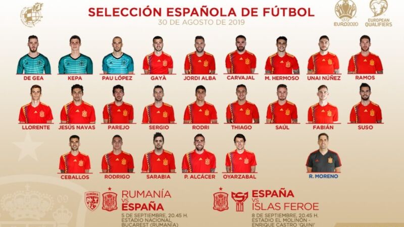 De esta lista, la primera de Moreno tras asumir las riendas de la selección el 19 de junio, se caen por lesión los centrocampistas del Real Madrid Marco Asensio e Isco Alarcón y el delantero del Atlético Álvaro Morata En la citación figuran los porteros David de Gea (Manchester United/ING), Kepa Arrizabalaga (Chelsea/ING) y Pau López (Roma/ITA); los defensas Sergio Ramos, Dani Carvajal (Real Madrid), Jesús Navas (Sevilla), Diego Llorente (Real Sociedad), Mario Hermoso (Atlético de Madrid), Unai Núñez (Athletic), José Luis Gayá (Valencia) y Jordi Alba (Barcelona). La completan los centrocampistas Dani Parejo (Valencia), Sergio Busquets (Barcelona), Rodri Hernández (Manchester City/ING), Thiago Alcántara (Bayern Múnich/GER), Saúl Ñíguez (Atlético de Madrid), Fabián Ruiz (Nápoles/ITA), Suso Fernández (Milan/ITA) y Dani Ceballos (Arsenal/ING); con los delanteros Mikel Oyarzábal (Real Sociedad), Rodrigo Moreno (Valencia), Paco Alcácer (Borussia Dortmund/GER) y Pablo Sarabia (PSG/FRA).