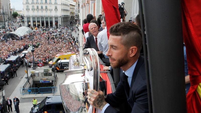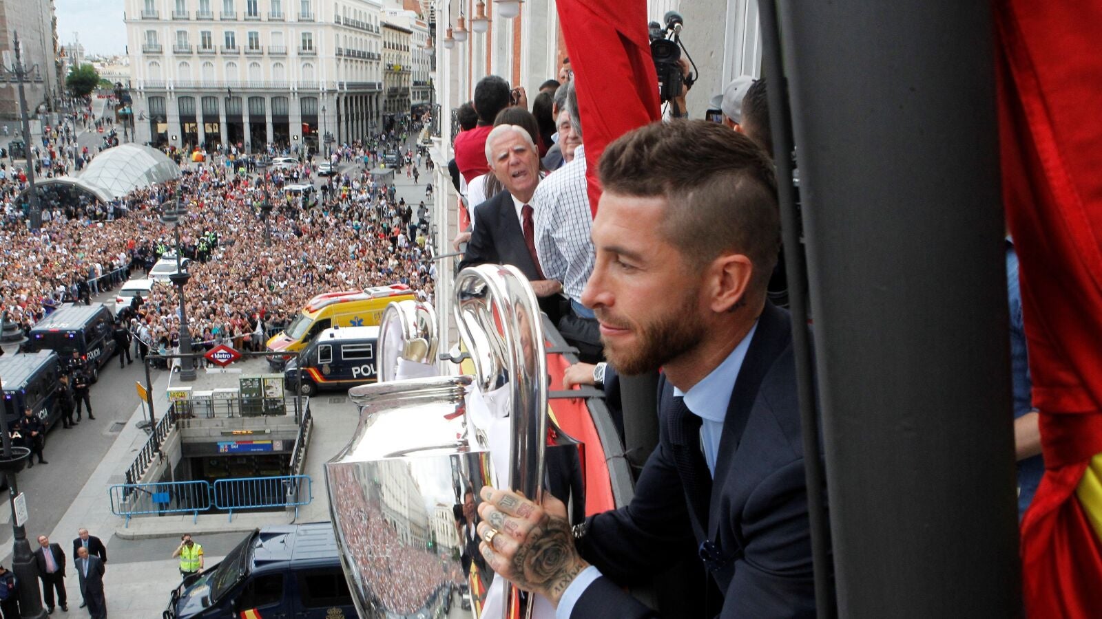 Ramos, desde el balcón de la sede de la Comunidad, y con la copa de la Liga de Campeones, se dirigió a los miles de aficionados del club blanco presentes en la Puerta del Sol.