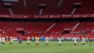 La Liga regresó en el Sánchez Pizjuán tras tres meses con la competición paralizada por la epidemia del coronavirus y lo hizo con un sentido minuto de silencio por los casi 28.000 muertos que se han registrado en España durante la pandemia de la COVID-19.