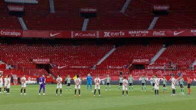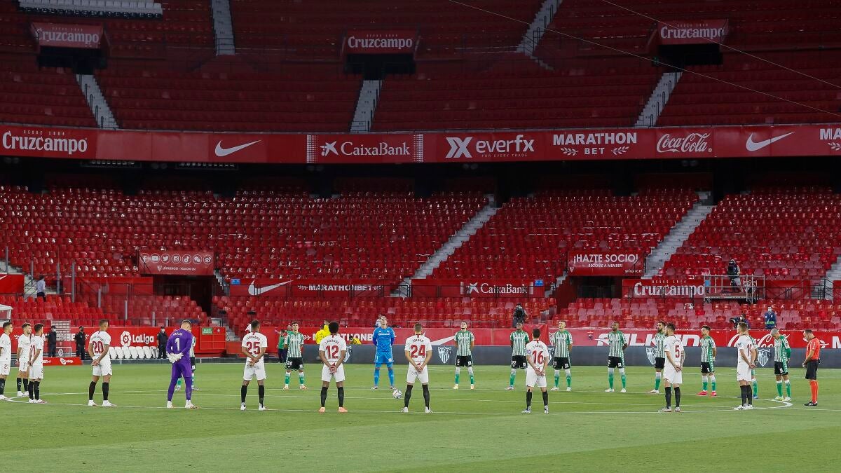 La vuelta de LaLiga estuvo precedida por un minuto de silencio en el Sánchez Pizjuán por los muertos en la epidemia del coronavirus en España. Los jugadores de Sevilla y Betis se posicionaron en el círculo central ante un estadio sin público.