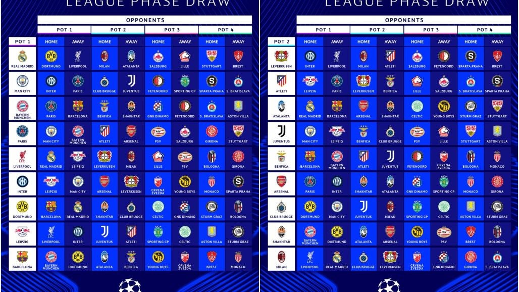 El sorteo de la fase liga da el pistoletazo de salida a una nueva era para la UEFA Champions League. El mayor cambio de la máxima competición continental se produce en la fase de grupos, que se convierte en una única fase liga de 36 equipos. Cada equipo se enfrenta a ocho rivales distintos (cuatro en casa y cuatro fuera).