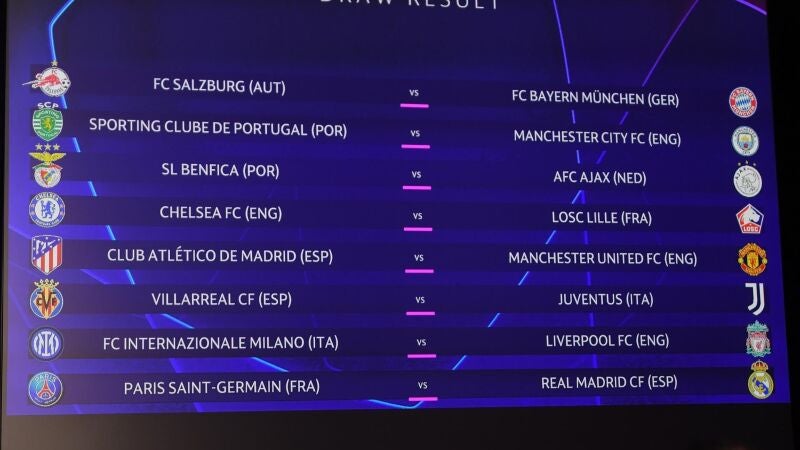 PSG - Real Madrid, Atlético de Madrid - Manchester United y Villarreal - Juventus, duelos de octavos de final de la Champions League.