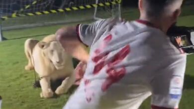 El futbolista griego se llevó el susto de su vida junto a un león en Emiratos Árabes.