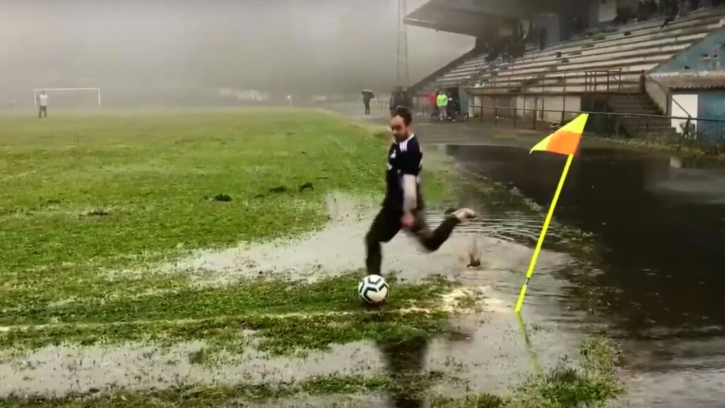Y así ha sido el partido del grupo cinco la Tercera División Gallega entre el SH Palmeira y el SD Xuventu Aguiño. Las imágenes hablan por sí solas. Se ha convertido en uno de los encuentros más virales de los últimos años. Dieron un espectáculo en el campo de Ventín (A Coruña) de garra , en que el balón se frenaba en los charcos de barro y con la dificultad de poder, incluso, mantenerse de pie.