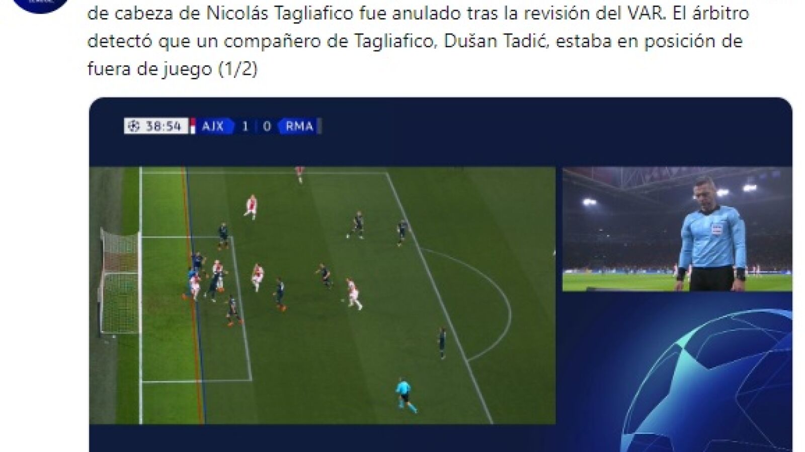 "En el minuto 38 del Ajax-Real Madrid, el gol de Nicolás Tagliafico fue anulado después de la revisión del VAR. El árbitro identificó que Tadic, compañero de equipo, estaba en posición de fuera de juego e interfería al portero, impidiéndole jugar o poder jugar el balón mientras se realizaba el cabezazo", explica UEFA.