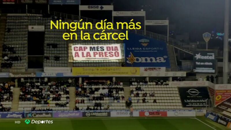 Un grupo de seguidores del Lleida han seguido los pasos de los aficionados azulgranas en el Clásico y han desplegado varias pancartas con frases de apoyo a los presos políticos. "Ni un día más en prisión", "democracia" o "libertad presos políticos" han sido las frases que se han podido ver en la grada del estadio.