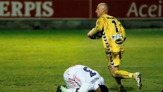 El vacile de Ibal Llanos a José Juan, veterano portero del Alcoyano y héroe en la histórica victoria ante el Real Madrid
