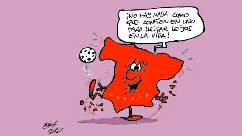 La viñeta gráfica de Alfredo Boto de esta semana se basa en la victoria de España. En la imagen podemos ver a nuestro país pintado de rojo y clamando: "No hay nada como que confíen en uno para llegar lejos". Y es que todos confiamos en ellos. Y ellos han devuelto esa confianza en el terreno de juego. La Selección Española ha logrado siete victorias de siete posibles en este torneo para alcanzar su cuarta Eurocopa.