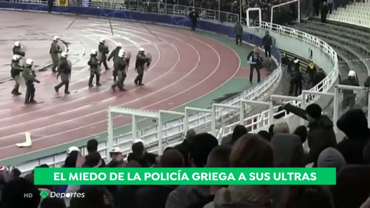 Y es que se pudo ver a la Policía con miedo ante el avance de los ultras griegos. Durante el descanso, se quedaron mirando a los encapuchados y sólo lanzaron un bote de humo para dispersarlos.