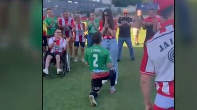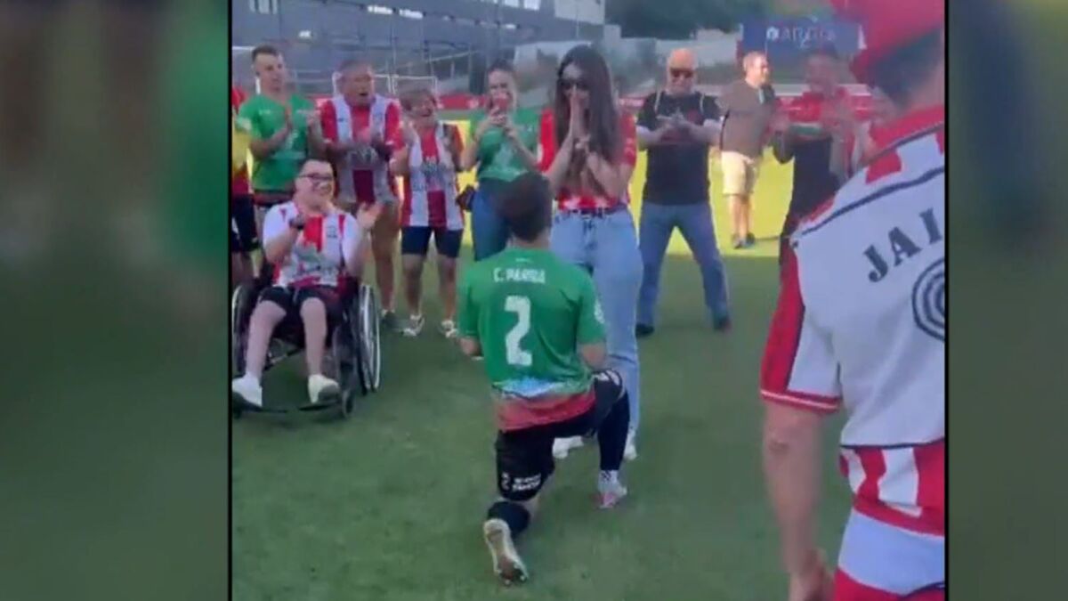 Carlos Parra, jugador del Zamora, aprovecha la celebración del ascenso de su equipo a Primera RFEF para pedirle matrimonio a su novia.
