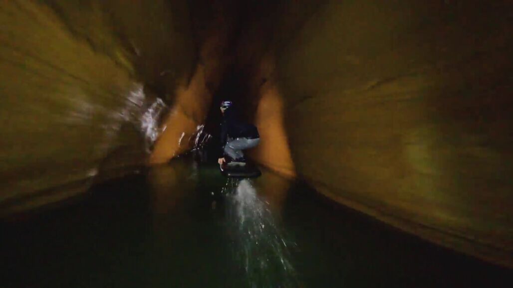 Un reto mayúsculo y lleno de riesgo teniendo en cuenta que el río discurre entre las paredes de una angosta cueva, cuyo máximo ancho es de tres metros. Cualquier error era sinónimo de estrellarse contra una pared. Pero eso no asustó a Brian Grubb, quien no dudó en acelerar su tabla, ponerse de pie y comenzar a surfear el angosto canal subterráneo entre rocas.
