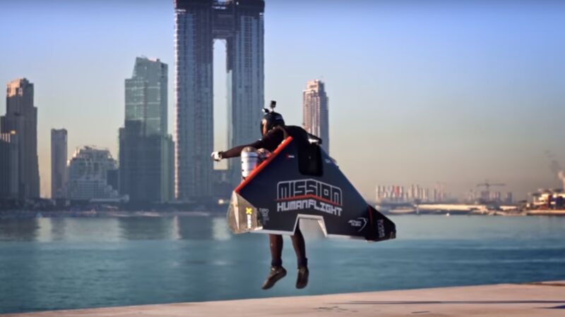 El 'skydiver' Vince Reffet ha sobrevolado Dubái gracias a un ala de carbono propulsado por cuatro pequeños motores a reacción consiguiendo llegar a los 240 kilómetros por hora.