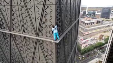 Los equipos de emergencia debieron descender diez pisos desde la azotea del rascacielos para inmovilizar al 'influencer' y 'meterlo' a través de un hueco abierto en la fachada, ya que el edificio está cubierto en su totalidad por una estructura metálica de mosaicos, imposibilitando acceder por un punto más cercano.