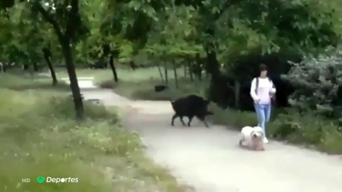 Un jabalí se cuela en un parque y está a punto de arrollar a una mujer que pasea por su perro y una mujer que corría junto a una arboleda.