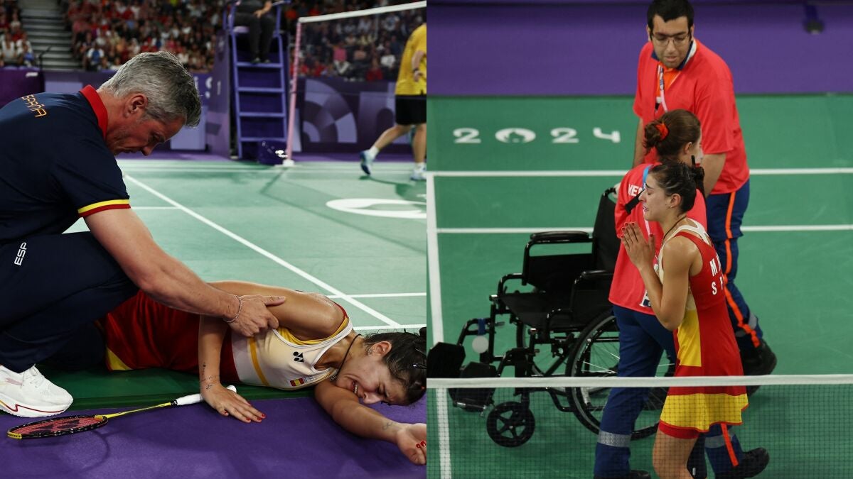 El momento de la lesión se produjo con la española dominaba por 21-14 y 10-6 a la china Bing Jiao He en la semifinales de los Juegos Olímpicos de París 2024. La triple campeona del mundo fue a por un volante y al apoyar su rodilla derecha sintió cómo se doblaba y se fue la suelo al instante. Su entrenador Fernando Rivas saltó al instante a la pista para ayudarla. Tras unos minutos en el suelo, Carolina se dirigió al banquillo, con evidentes gestos de dolor, y se colocó una protección en su rodilla derecha para tratar de seguir. Jugó dos puntos, pero era imposible. La campeona española se tumbaba en el fondo de la pista, rota de dolor y entre lágrimas.