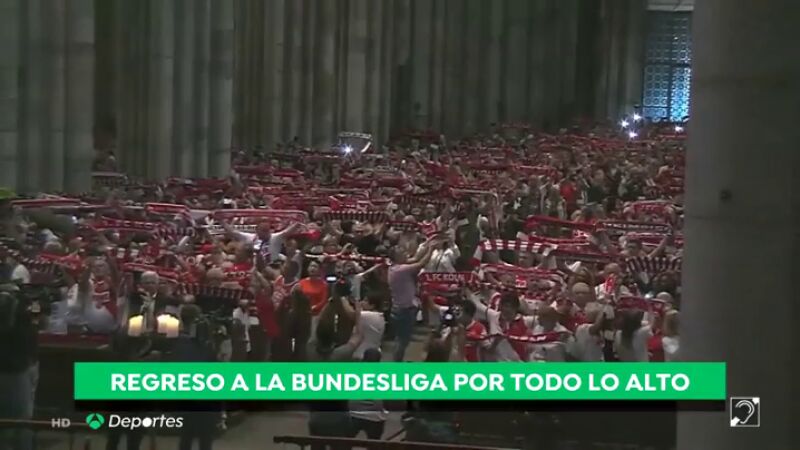 La afición del Colonia, equipo de la Bundesliga, fue a la catedral de la ciudad para celebrar que esta temporada jugarán en la máxima división alemana.