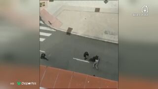 Los vecinos decidieron tirarle un cubo de agua mientras el 'runner' pasaba bajo sus ventanas. "Date una ducha cab***", se puede oír en el vídeo completo.