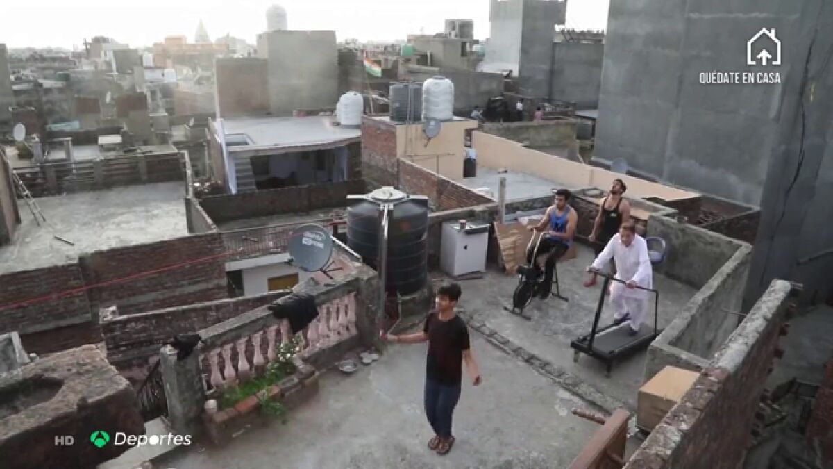 Un grupo de vecinos han montado este gimnasio improvisado en una azotea de la India para entrenar durante la crisis del coronavirus.