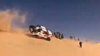 El Toyota Hilux del español y de Marc Coma cae por la duna dando un par de vueltas de campana para aterrizar de pie ante la atenta mirada de varios aficionados que alucinaban con el accidente. El español está esperando asistencias; al parecer, tendría dos ruedas pinchadas.