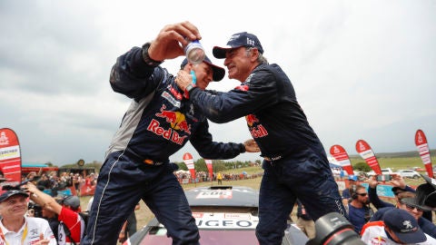 Sainz celebró su triunfo subido encima de su Peugeot junto a su copiloto Lucas Cruz tras terminar los 120 kilómetros cronometrados de la decimocuarta y última etapa del rally, ganada por el sudafricano Giniel De Villiers.