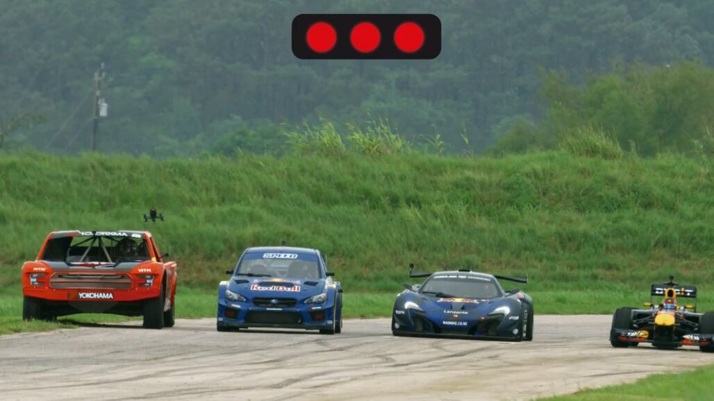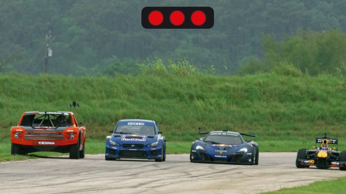 Una carrera entre coches de distintas disciplinas tenía que tener un desenlace inesperado, sobre todo si competían en las mismas condiciones. De inicio sobre asfalto y en línea recta un Fórmula Uno no tiene rival ante un coche de rallies, otro de drift, de derrapes, o un todoterreno, pero ¿y si hacemos cuatro trazados diferentes?
