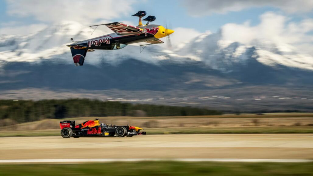 Parece una película de acción pero esto es real. Dos campeones. Uno por el asfalto... y otro por el cielo. Uno a los mandos de un monoplaza y el otro pilotando un avión. Red Bull promovió este increíble reto en la República Checa y Eslovaquia.