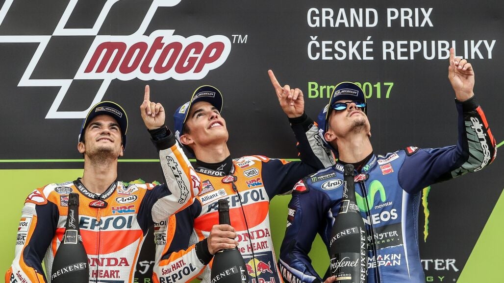 El piloto español Marc Márquez (Repsol Honda) ha logrado la victoria, tercera del año, en la carrera de MotoGP en el Gran Premio de la República Checa, en un podio íntegramente español junto a Dani Pedrosa (Repsol Honda) y Maverick Viñales (Yamaha) que ha servido como homenaje para Angel Nieto, fallecido este jueves a los 70 años como consecuencia de las heridas ocasionadas por un accidente de tráfico.