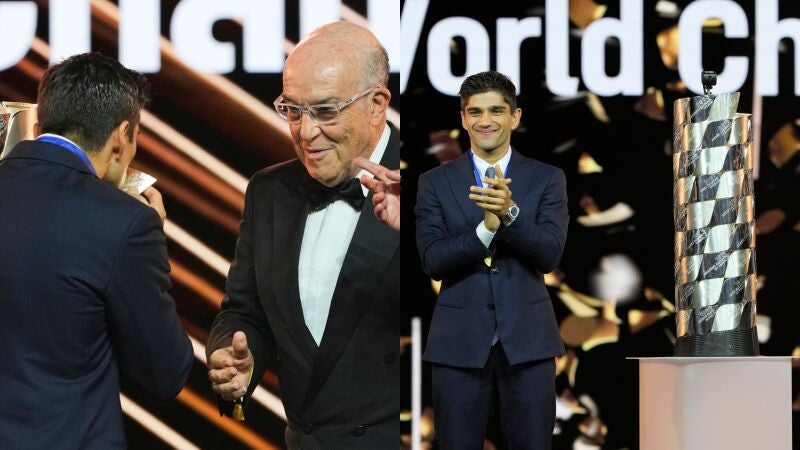 El piloto madrileño se coronó este domingo campeón del mundo del MotoGP, el quinto español en lograrlo. Anoche, en la gala celebrada en Barcelona cumplió con la tradición de colocar la placa con su nombre en el icónico trofeo de MotoGP.