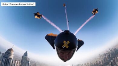 El paracaidista sudafricano ha pasado por 'el ojo de aguja', del Ciel Dubái Marina, a 230 kilómetros por hora acompañado por otros miembros del equipo de paracaidismo XDubai.
