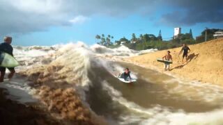 Esta Navidad ha caído un temporal de lluvia torrencial sobre Hawai y después de la tormenta llegó la calma, aunque relativa. Los surfistas han abierto una vía de escape para que el río Waimea desemboque en el mar y han aprovechado esa corriente para coger las olas.