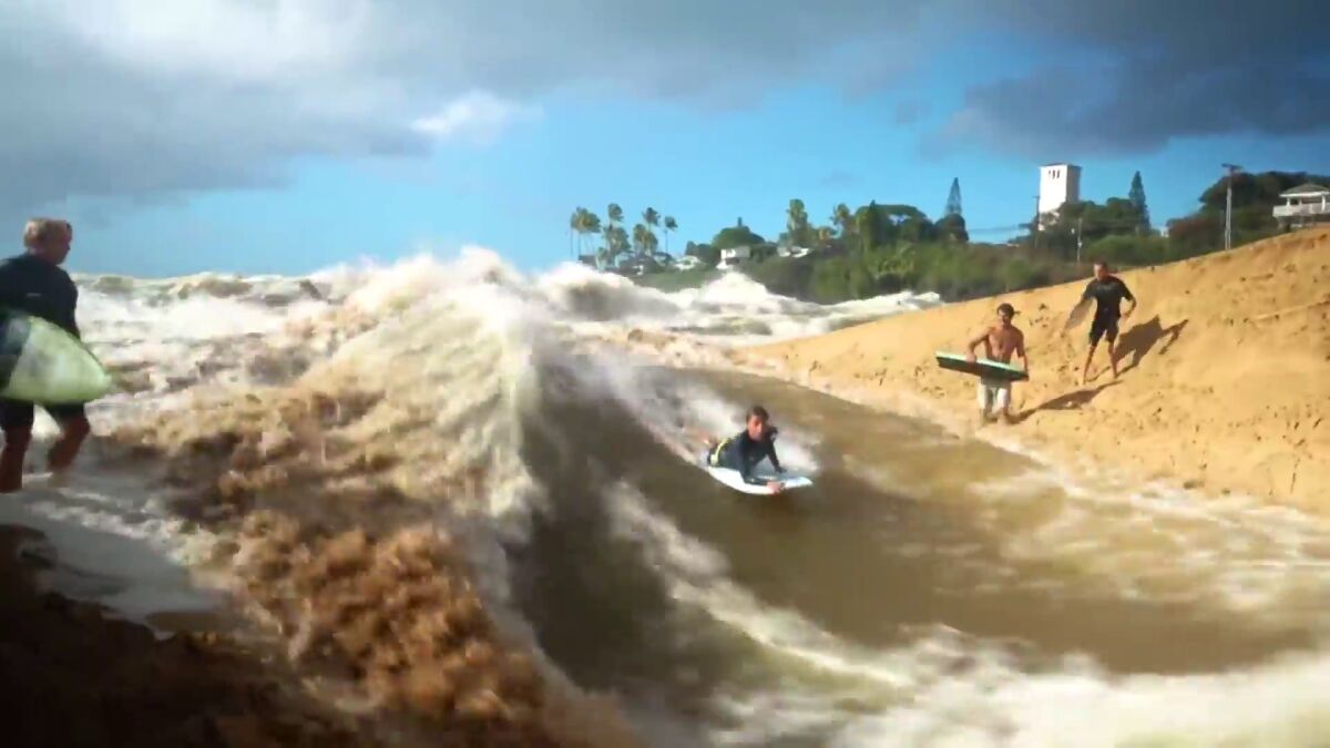 Tormentas torrenciales han descargado en Navidad sobre las islas Hawainas y ahora los ríos bajan desbordados. Los surfistas han cavado en la arena una zanja que va desde el río Waimea hasta el mar.
