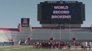 Rob Gronkowski ha vuelto a sus orígenes, al estadio de la Universidad de Arizona, pero esta vez para romper un récord del mundo de lo más curioso. Se trata del lanzamiento de balón de fútbol americano más alto y largo del mundo. Se lo han lanzado desde 600 pies de altura, o lo que es lo mismo, 180 metros y han tenido que hacerlo desde un helicóptero.