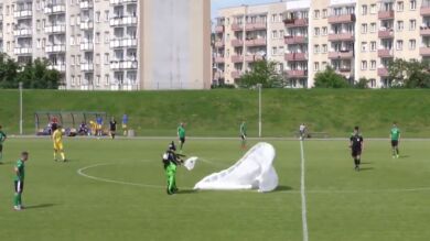 Ocurrió en un partido en Polonia, el paracaídista no calculó bien su aterrizaje y terminó cayendo en un campo de fútbol. Los jugadores alucinaban.